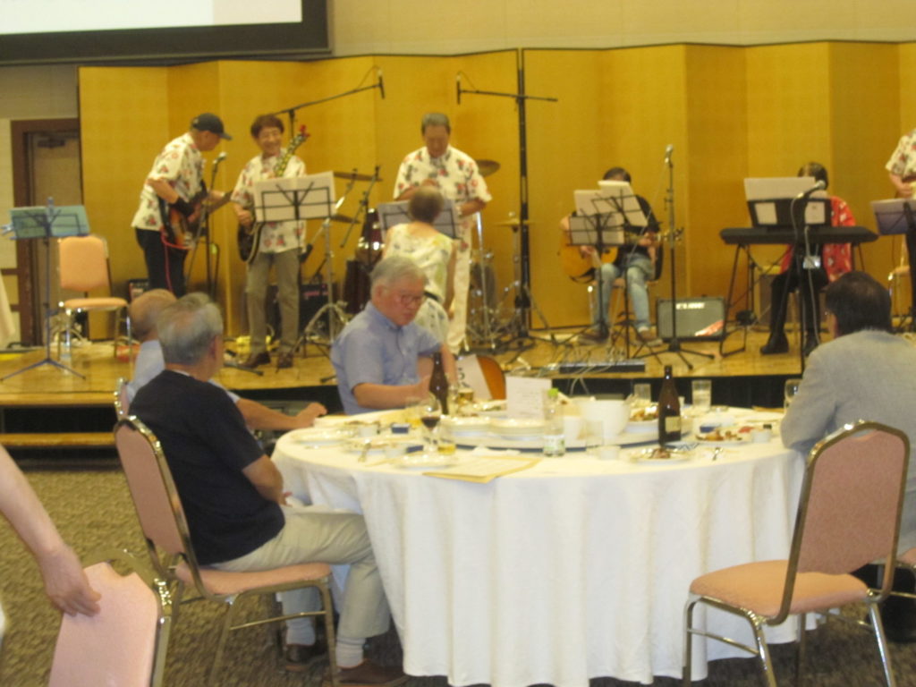 今回も記念撮影、校歌斉唱、総会を経て、懇親会へと進行し、懇親会では恩師、物故者の遺影をプロジェクションし、会員一同哀悼の誠を捧げました。その後久しぶりの参加者から一言頂戴するなどして和気藹々と懇談し、会の締めは卒後30年に結成したバンド「The Sunsets」のOldiesの演奏で盛り上がり、会を終えました。